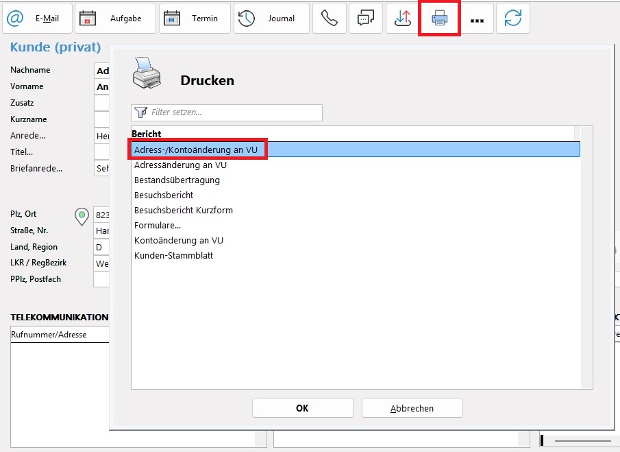 Ein wichtiger Punkt im täglichen Geschäft eines Versicherungsmaklers ist die Übereinstimmung von Kunden- und Vertragsdaten mit den Daten der jeweiligen Gesellschaft. Für diesen Zweck haben Sie die Möglichkeit, eine Adress- / Kontoänderungsmitteilung oder nur eine Adressänderungsmitteilung zu erstellen, um diese dann an die beteiligten Gesellschaften per Email, Fax oder Anschreiben zu versenden.