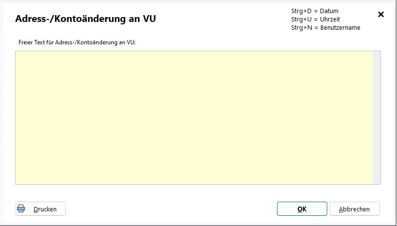 10. Es erscheint nun eine Maske zur Eingabe eines freien Textes, der auf der Adress- / Kontoänderungsmitteilung angedruckt werden soll.