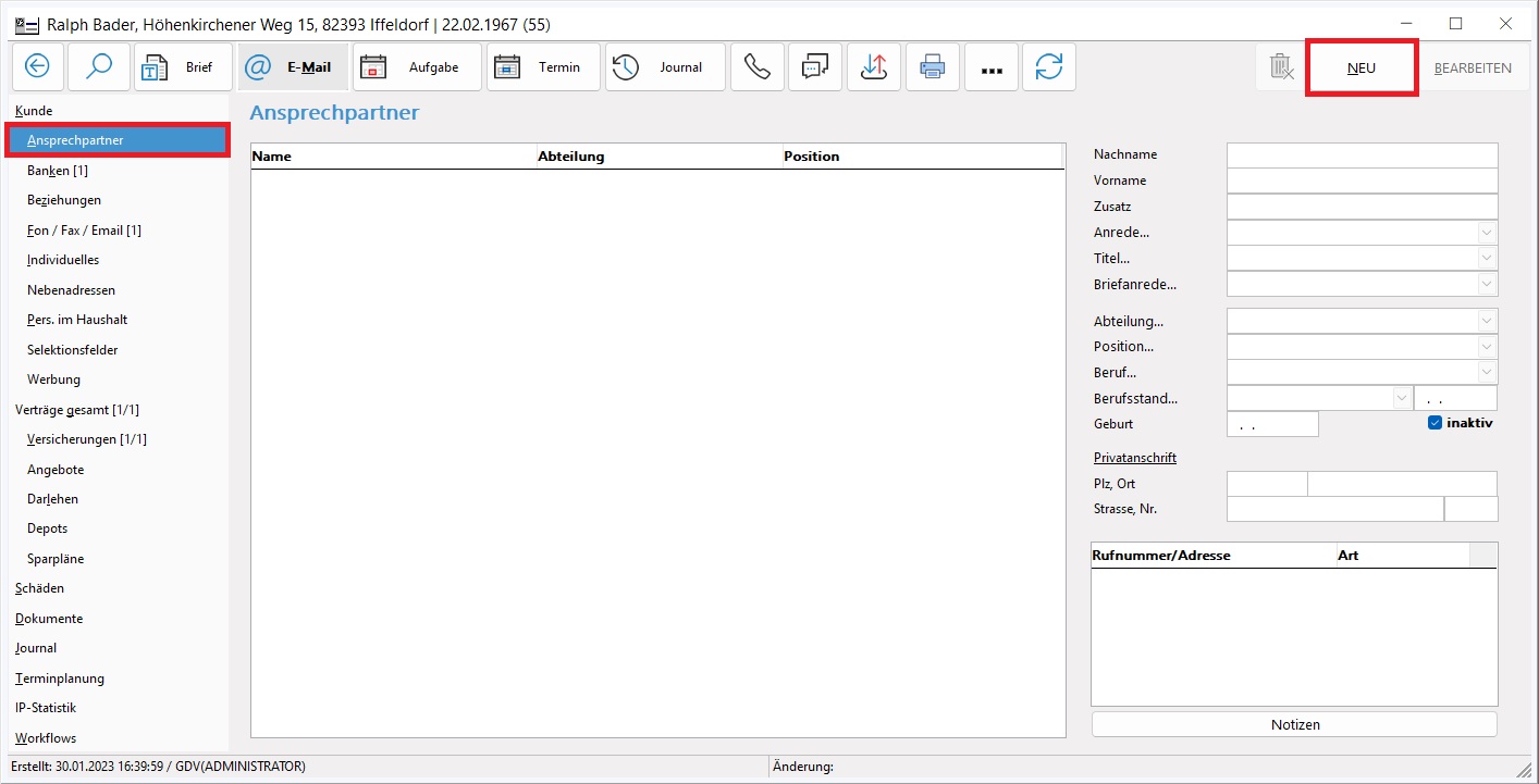 Um einen neuen Ansprechpartner anzulegen, gehen Sie in der Kundenmaske und klicken Sie auf die Schaltfläche „Ansprechpartner“. Anschließend wählen Sie „Neu“, um einen neuen Ansprechpartner hinzuzufügen.