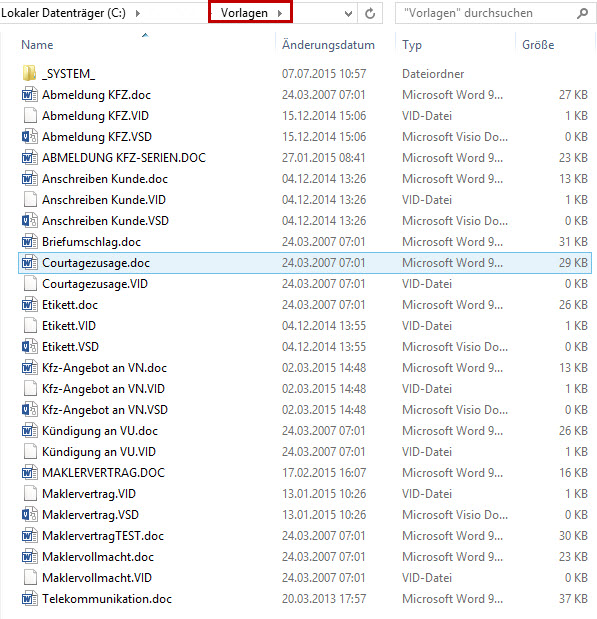 Sie befinden sich jetzt im ProClient-Hauptordner (..\ProClient\). In diesem Verzeichnis befindet sich ein Ordner Vorlagen, bitte öffnen Sie diesen. Der Pfad sollte jetzt ..\ProClient\Vorlagen\ heißen.