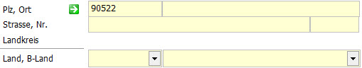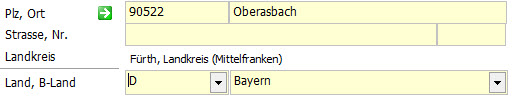 Durch Eingabe der Postleitzahl in das Feld „PLZ“ und das Verlassen des Feldes mit der Taste „Enter“ wird automatisch das Land, Bundesland, Regierungsbezirk und natürlich die Stadt eingetragen.