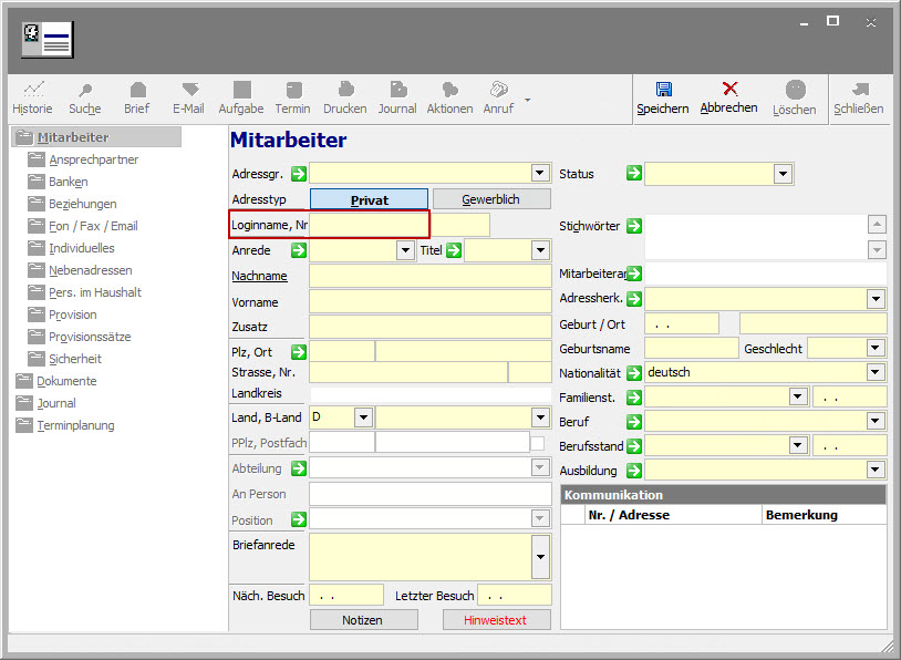Hinweis: Bitte beachten Sie, daß bei der Löschung eines Mitarbeiters alle den Mitarbeiter betreffenden Aktivitäten, Dokumente, Provisionssätze usw. unwiderruflich gelöscht werden. Die Löschung eines Mitarbeiters nur dann möglich, wenn die entsprechenden Benutzerrechte vorhanden sind und keinerlei Zuordungen zu Kunden, Verträgen, Provisionsbuchungen usw. bestehen.