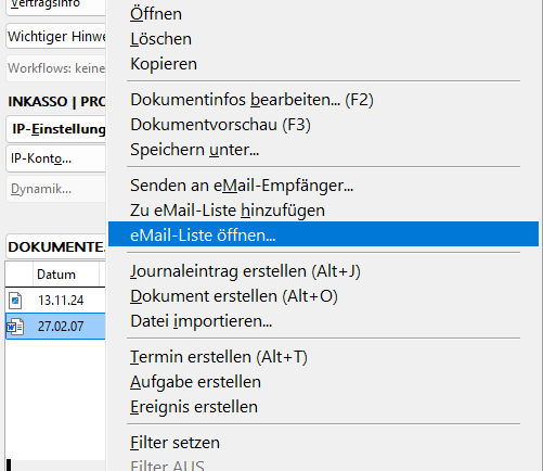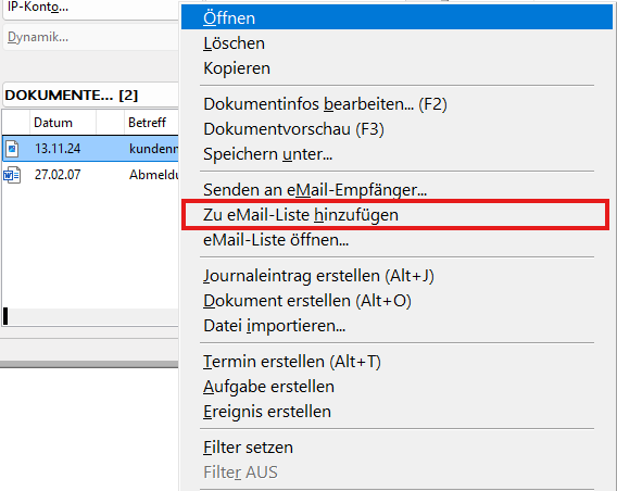 Markieren Sie eins oder mehrere Dokumente und öffnen mit Rechtsklick auf die ausgewählten Dokumente ein Menü, in dem Sie den Punkt „Zu eMail-Liste hinzufügen“ auswählen können.