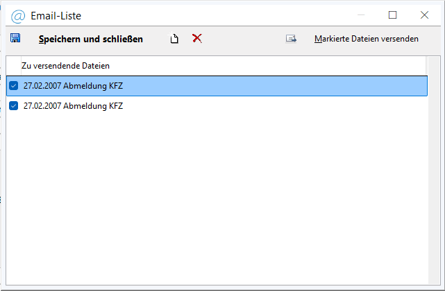 Speichern & Schließen: Alle ausgewählten Dokumente werden in der E-Mail-Liste beibehalten und das Fenster wird geschlossen.
