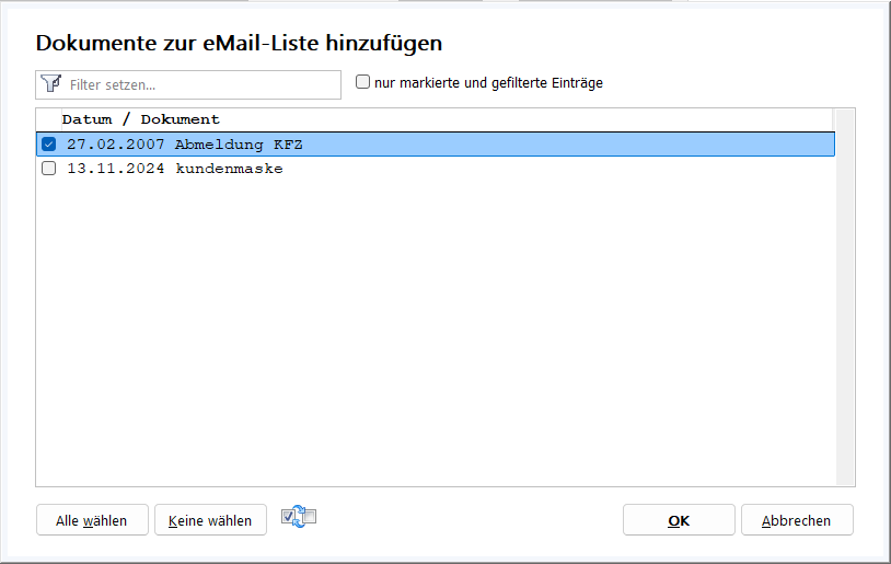 Sie können Ihre Auswahl, welche Dokumente zur Liste hinzugefügt, in diesem Fenster erneut überprüfen und anpassen. Sobald Sie mit der Auswahl durch sind, können sie mit „OK“ ihre Auswahl bestätigen und das Fenster wird geschlossen.