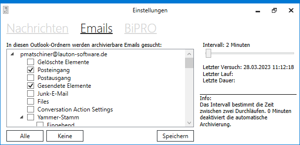 Sollen E-Mails von einer bestimmten Adresse (werber@werbung.de) oder Domain (z.B. “@werbung.de“) nicht archiviert werden, dann können Sie dies unter: „Standardeinstellungen“ → „Dokumentenmanagement“ unter den Schaltflächen „zu ignorierende Domains“ und „nicht automatisch archivieren (eingehend)„ hinterlegt werden.