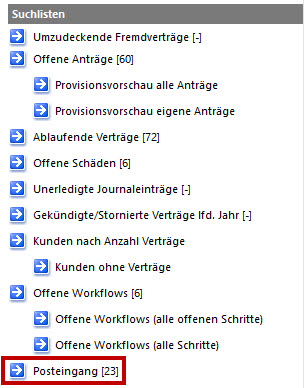 Im Info-Center (rechte Seite) können Sie unter den Suchlisten den „Posteingang“ öffnen.