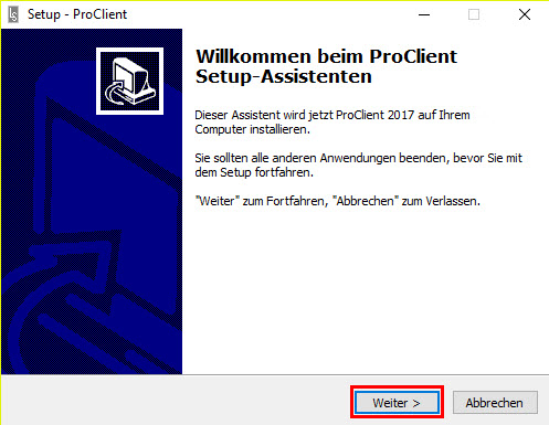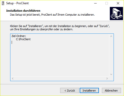 Für die Installation empfehlen wir das Installationsverzeichnis auf „C:\ProClient\“ einzustellen. Nachdem Sie Ihr Verzeichnis ausgewählt haben, mit „Weiter“ fortführen.