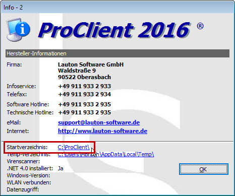 Es wird auf die „Info -2“-Seite gewechselt. Im unteren Bereich finden Sie den Eintrag: „Startverzeichnis: C:\ProClient\“.