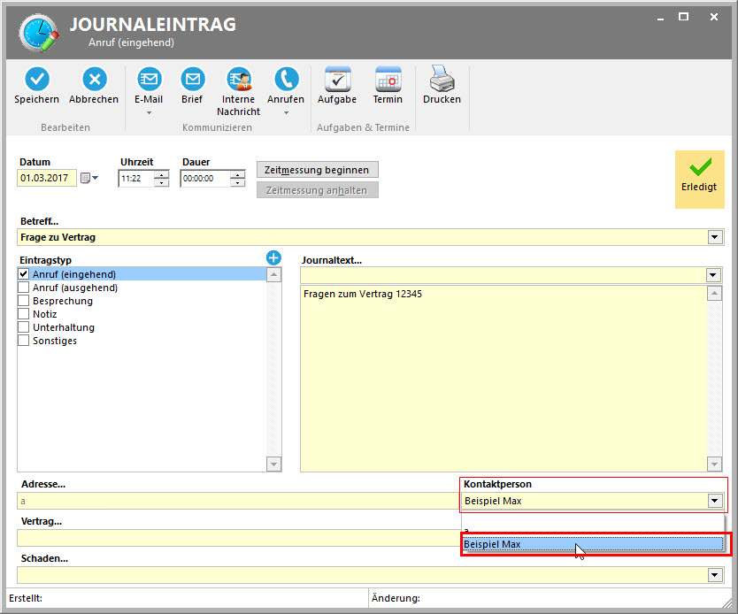 Ansprechpartner zu einem Journaleintrag hinzufügen
